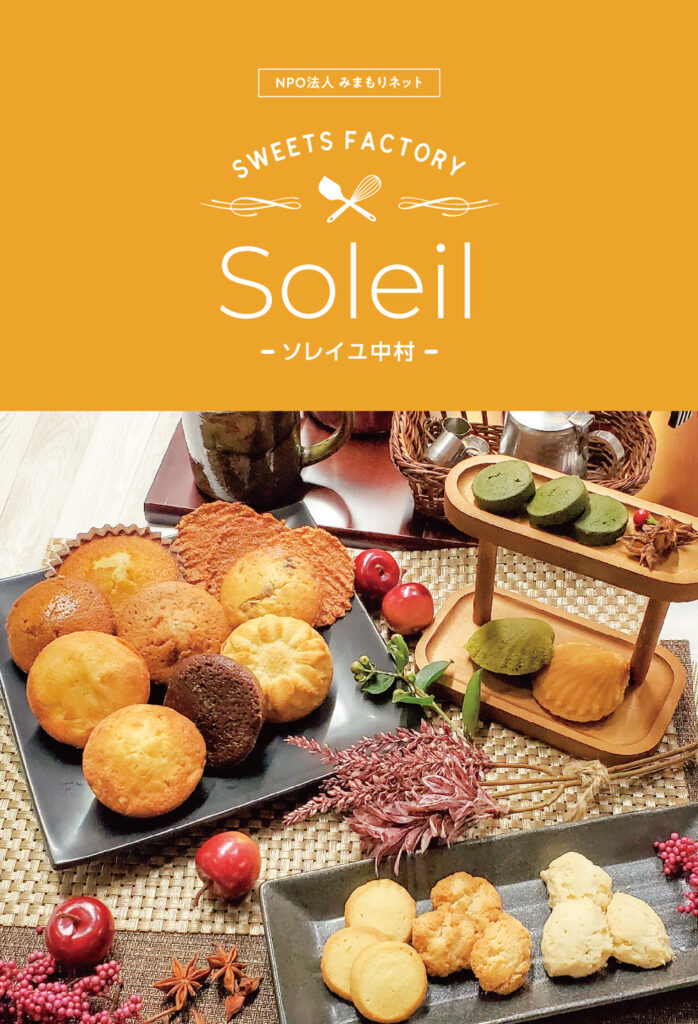 就労継続支援B型事業所「ソレイユ中村」では、心をこめてひとつひとつ手作業で丁寧に焼き上げたお菓子を作っていて、安心できる素材を使ったやさしい味わいです。お菓子作りを通じて、利用者さんが自分らしいペースで作業をしながら、技術や社会性を身につけるようサポートしています。お客様からの「おいしいね」「ありがとう」といった温かい言葉が、日々の励みとなって地域の方々にも喜んでいただける商品づくりをサポートしています。